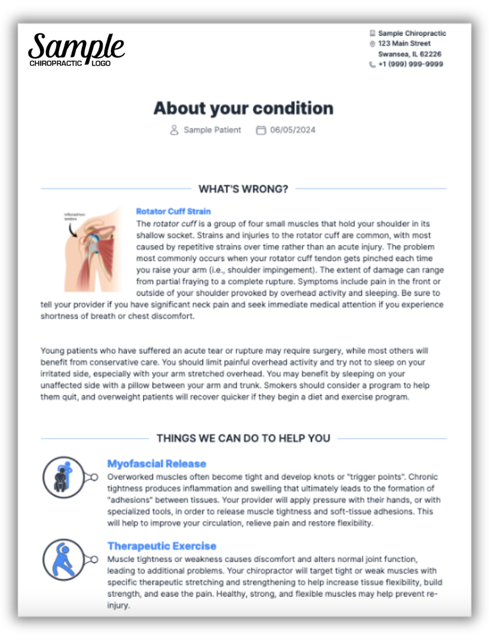 💡 Deeper Dive: ChiroUp subscribers can streamline this process by automatically sending patients a detailed condition report, which addresses all these key points and fosters greater patient engagement and understanding.