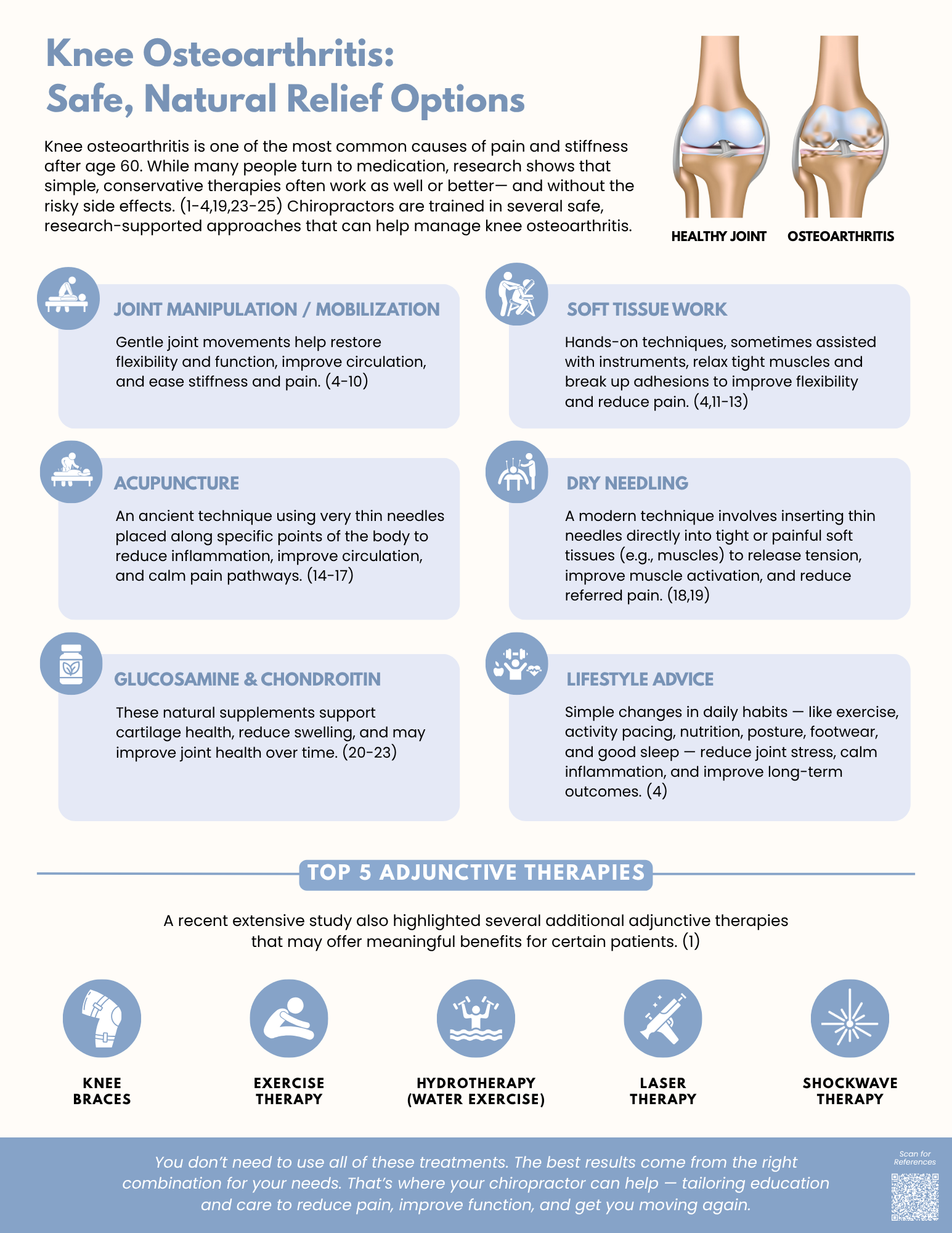 The good news? Research confirms that conservative, non-drug therapies often rival or outperform medications for knee osteoarthritis pain relief — without the dangerous side effects. (2-4,19,23,24) Many chiropractors are uniquely positioned to deliver these therapies, combining manual expertise, functional rehabilitation, and evidence-based adjunctive tools.*