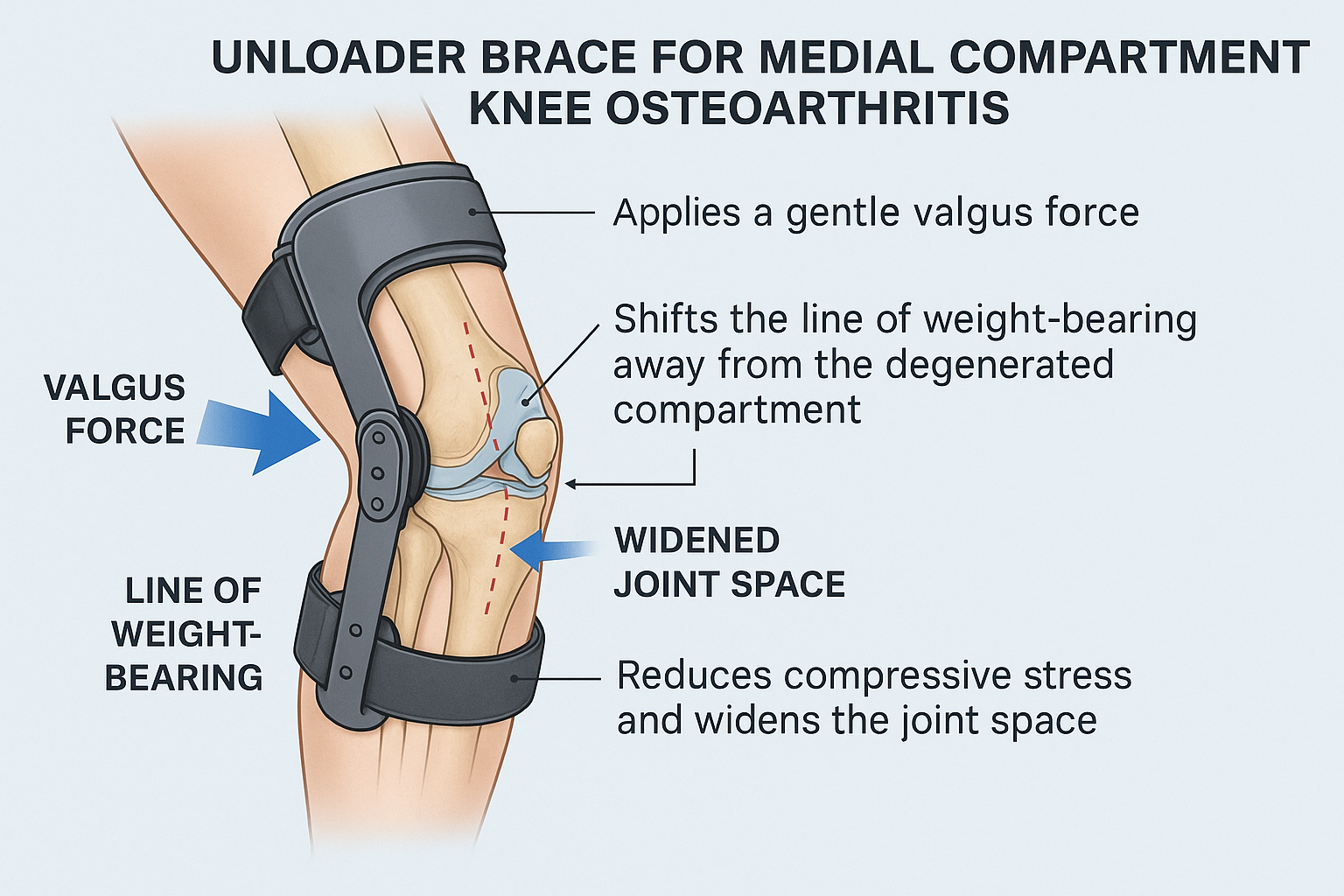 An unloader brace for knee osteoarthritis is a simple but powerful tool for patients with medial compartment knee osteoarthritis. By applying a gentle valgus force, these braces shift the line of weight-bearing away from the degenerated compartment, reducing compressive stress and widening the joint space during gait. Clinically, this translates into less pain, improved walking mechanics, and greater functional tolerance for daily activities. Beyond offloading cartilage, knee unloader braces also enhance proprioception, stabilize the knee in unstable conditions, and reduce muscle fatigue—all of which help prolong mobility and delay disease progression. The result is immediate gait improvement and pain relief, making a knee support for osteoarthritis one of the most effective non-drug treatments.