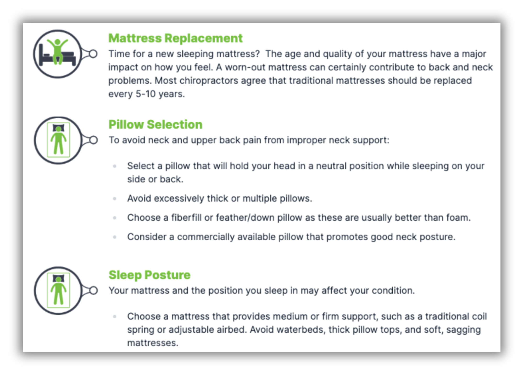 Use ChiroUp’s handy ADL for mattress and pillow guidance by attaching it to any condition report to provide patients with expert sleep tips.