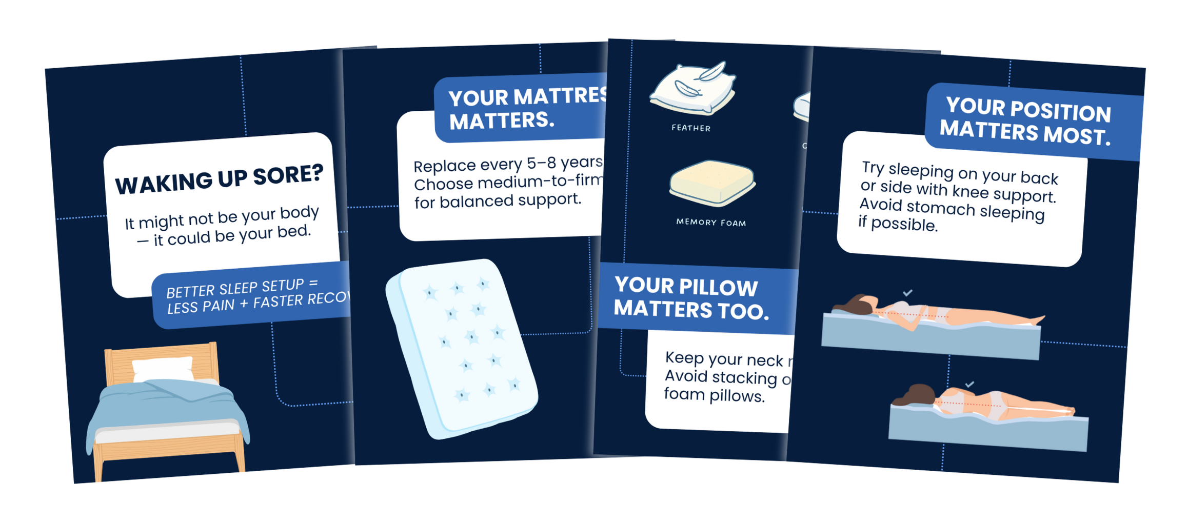 Use this carousel post to educate patients on how sleep affects pain and recovery. Each slide breaks down practical tips on mattresses, pillows, sleep positions, and bedtime habits.